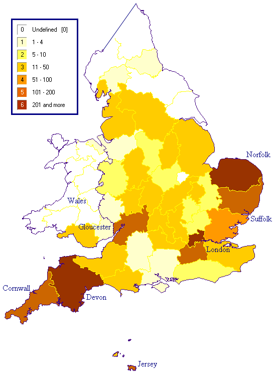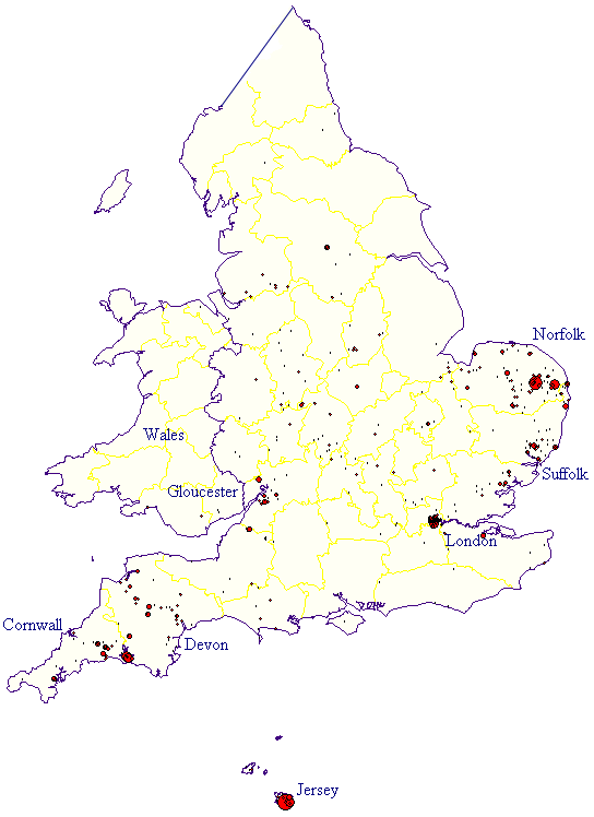 Some large population centres of note are: St Helier, Grouville, and St Martin (Jersey); Norwich, Halvergate, and Heigham (Norfolk); Plymouth, Stoke Damerel, North and South Tawton (Devon); Kessingland, Grundisburgh, and Orford (Suffolk); Bristol, Longhope, and Stinchcombe (Gloucester); St Neot, Liskeard, St Gluvias, and Duloe (Cornwall); and London.